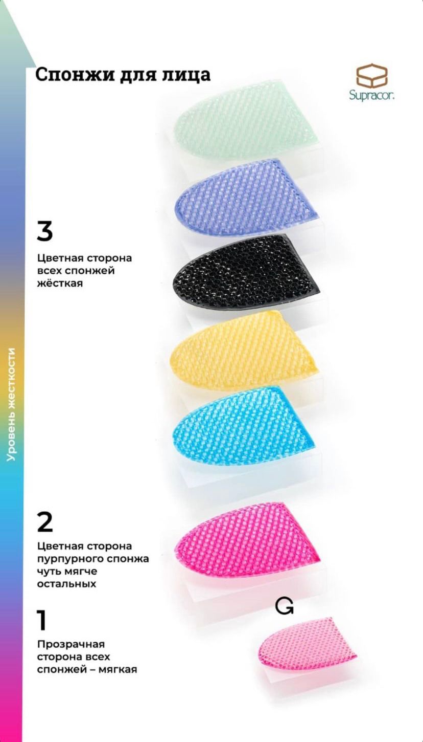 • Принципиально новый спонжик для лица. Используется для очищения, отшелушивания отмерших клеток кожи и удаления косметики. Для этого нанесите на более мягкую сторону спонжика любимое очищающее средство и круговыми движениями очистите кожу лица, шеи и область декольте. Используйте цветную часть спонжика для очищения областей с менее нежной кожей, например, тыльной стороны кистей рук и предплечья. Массаж Используйте спонжик как средство для 5-минутного омолаживающего массажа лица, стимулируя приток крови и лимфы для снижения отёчности, удаления токсинов и активизации обновления клеток. Для этого нанесите любимый крем или увлажняющее средство для лица на цветную сторону спонжика и небольшими круговыми движениями, слегка надавливая и двигаясь от центра лица, массируйте области лба, глаз, щёк, губ и подбородка. После использования тщательно выжмите спонжик и стряхните излишки воды. Материал спонжика является естественно стойким к воздействию плесени, грибков и бактерий.